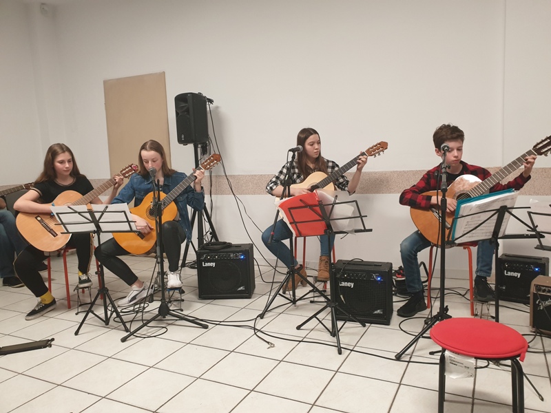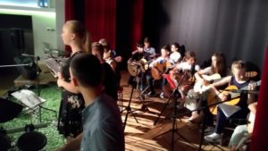 We wtorek 16.04.2019 w sali przy ul. Borowskiej 133 odbył się koncert uczniów klasy gitary . Uczniowie zaprezentowali swoje umiejętności występując w zespołach o zróżnicowanym składzie , wykonując ciekawy repertuar zaaranżowany przez p. Dominikę Białostocką , która prowadzi sekcję gitar. Podczas koncertu uczniowie prezentowali również umiejętności wokalne , które znakomicie uzupełniają naukę gry na gitarze.